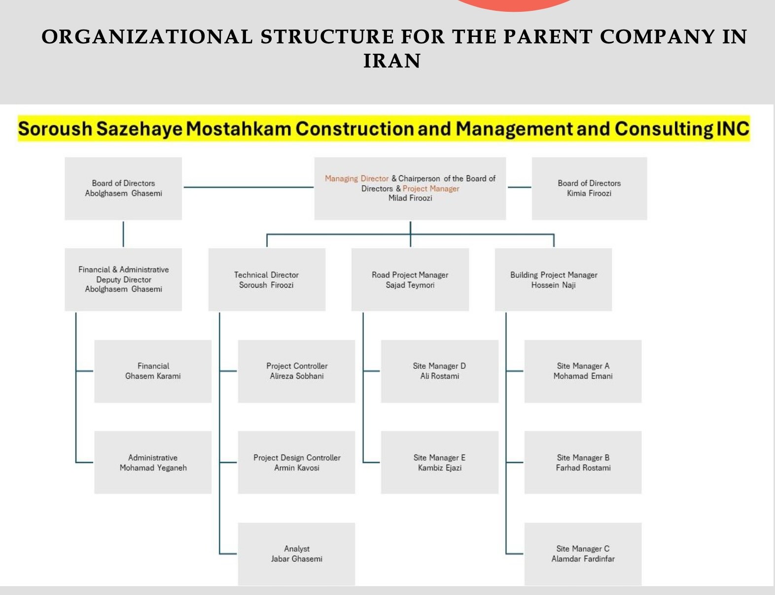 SOROUSH SAZEHAYE MOSTAHKAM CONSTRUCTION INC Management and Consulting Inc. operates under the Highway, street, and bridge construction, and Commercial and institutional building construction.
